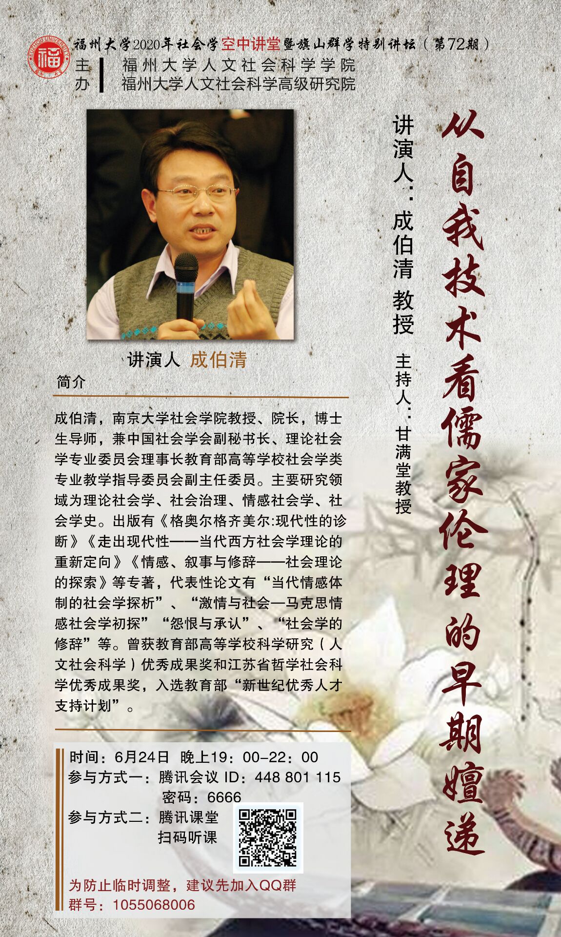 演讲人简介:成伯清(1966-),南京大学社会学院教授、院长、博士生导师,校学位委员会委员,兼中国社会学会副秘书长,理论社会学分会候任会长。入选教育部“新世纪优秀人才计划”。主要研究领域为理论社会学、情感社会学、社会学史。主要代表著作有:《情感、叙事与修辞——社会理论的探索》(2012)。在《社会学研究》、《社会》、《南京社会科学》、《探索与争鸣》等学术刊物上发表论文数十篇。