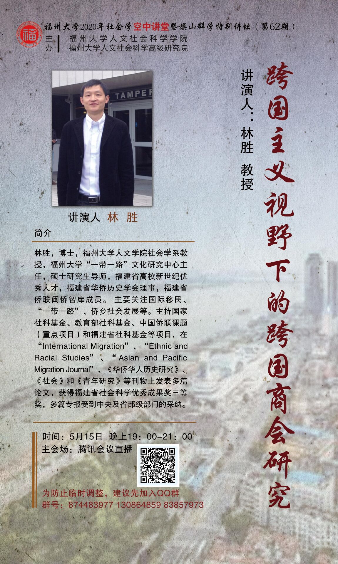 演讲人简介:林胜,博士,js6668金沙登录入口人文学院社会学系教授,js6668金沙登录入口“一带一路”文化研究中心主任,硕士研究生导师,福建省高校新世纪优秀人才,福建省华侨历史学会理事,福建省侨联闽侨智库成员。主要关注国际移民、“一带一路”、侨乡社会发展等。主持国家社科基金、教育部社科基金、中国侨联课题(重点项目)和福建省社科基金等项目,在“International Migration”、“Ethnic and Racial Studies”、“Asian and Pacific Migration Journal”、《华侨华人历史研究》、《青年研究》和《社会》等刊物上发表多篇论文,获得福建省社会科学优秀成果奖三等奖,多篇专报受到中央及省部级部门的采纳。